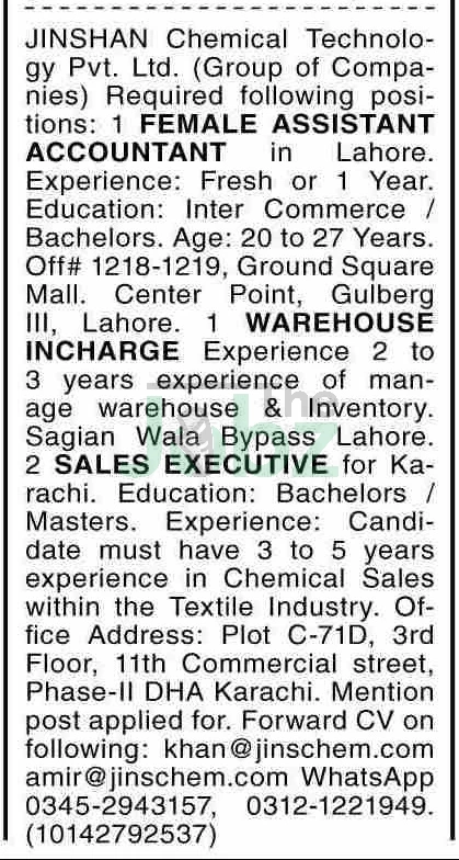 The latest job openings at Jinshan Chemical Karachi include roles in: